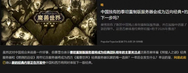 那么问题来了,经典团队目前还在开发的项目有MOP怀旧服、20周年纪念服(明年升级TBC)和新plus服,如果泰坦服是经典团队明年的重点工作,这是不是意味着新plus服将被搁置,开发优先级和资源将会低于泰坦服,作为欧美怀旧服玩家仅剩的安慰,他们明年还能看到新plus服吗?
