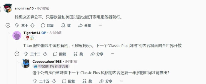 有的网友表示乐观,认为欧美还是有机会开泰坦服的,但是很快就有网友泼冷水,强调泰坦服是特供的,更有忧心忡忡的玩家担心经典开发团队将太多的精力用到了泰坦服了,或许会导致新plus服要多等一年,也就是2027年才会上线。