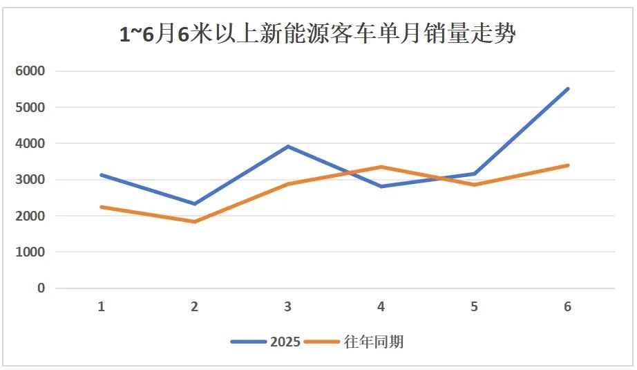 ]article_adlist-->中国客车统计信息网数据显示,2025年6月,国内重点客车企业销售6米以上新能源客车5499辆,同比增长62.64%,环比增长74.57%。上半年,国内共销售6米以上新能源客车20788辆,同比增长32.78%。